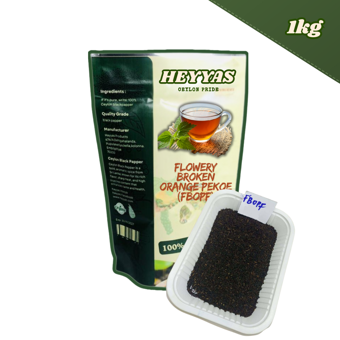 Premium Ceylon FBOPF (Flowery Broken Orange Pekoe Fannings) tea, handpicked from Sri Lanka’s highland estates. Known for its fine leaf style, smooth taste, and aromatic golden liquor. Available in 100g, 200g, 500g, and 1kg packs.